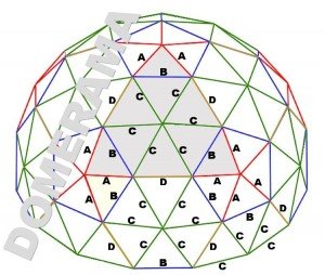 3V 5/9 Flat Base Kruschke Calculator Build your own geodesic dome Click on images below to view other 3V geodesic dome calculators This 3V 5/9 Kruschke geodesic flat base dome calculator is multi-purpose This is also a reverse geodesic dome calculator It will calculate any size of dome and display the lengths for each strut, total amount of material required, the weight of your geodesic dome and even the amount of material to cover your geodesic dome. Enter any value in any yellow box and it will calculate all other corresponding values. For example you can specify a 2-foot length for strut “B” and all other struts and related values will be calculated. Important note about odd geodesic dome frequencies (i.e. 3V, 5V) Most geodesic dome calculators on the Web don’t give a flat base. The calculator below takes a different approach, giving the dome a flat base for both the low- and high-profile versions (more than half a sphere or less than half a sphere). For a more detailed explanation, click here. NOTE: If you enter a measure in feet, your results are in feet or, in the case of floor area, square feet. Same goes for meters. When entering in feet, decimals are fractions of a foot or square foot (for example: 2.75 = 2’9″). Spherical radius Spherical diameter Height Floor area Perimeter Perimeter: total length of all base struts feet (or meters) of pipe/lumber NOTE: if bolting struts, you need to add extra length to your total above. The formula is: (tip to hole center) X 2 X number of struts. Ex.: a dome requiring 100 struts with bolts 3/4″ from the tip requires 100 X 3/4″ X 2 = 150 inches (12.5 feet) more to the total above. STRUTS ANGLE 30 X “A” 9.49° 35 X “B” 11.02° 80 X “C” 12.16° 20 X “D” 12.74° 165 STRUTS For conduit, you can round bend angles to the nearest degree. For timber domes, angles should be to the nearest tenth of a degree. Click here for assembly diagram Struts are vertex to vertex To connect together with bolts, you need to make them longer to drill holes in them. If you wish to build this dome out of lumber/timber, please click on the button below for important details Connecting struts Many types of connectors are available for steel and timber geodesic dome. For more information, click here. If you use hubs 40 X 6-way connectors 6 X 5-way connectors 15 X 4-way connectors OR If you bolt struts together 61 bolts 61 nuts 122 washers For more information on cutting, bending and flattening struts, click here Floor Surface and Capacity Your calculated floor surface area is SQUARE FEET/METERS NOTE: RESULTS IN THIS SECTION ARE BASED ON FEET. Geodesic Dome floor Capacity Concrete Cubic feet Cubic yards 4″ slab 6″ slab 8″ slab Plywood 1/2″ 4′ X 8′ sheets Estimated standing capacity Estimated dining capacity Estimated conference capacity For more info on capacity, click here How much will your geodesic dome weigh? Your calculated geodesic dome diameter is NOTE: RESULTS IN THIS SECTION ARE BASED ON FEET. 1/2″ 3/4″ 1″ 1 1/4″ 1 1/2″ 2″ EMT Wall thickness 0.042″ 0.049″ 0.057″ 0.065″ 0.065″ 0.065″ Lbs. kgs. STEEL SCHEDULE 40 Wall thickness 0.109″ 0.113″ 0.133″ 0.140″ 0.140″ 0.154″ Lbs. kgs. ALUMINUM SCHEDULE 40 Wall thickness 0.109″ 0.113″ 0.133″ 0.140″ 0.140″ 0.154″ Lbs. kgs. LUMBER 2″ X 4″ 2″ X 6″ 2″ X 8″ Lbs. Kgs. How much will your geodesic dome cost?The tables show sample costs. Material prices vary with suppliers and area. Your calculated geodesic dome requires feet (or meters) of pipe / lumber NOTE: THIS SECTION ONLY ESTIMATES COST IN FEET. Galvanized pipe – Steel Schedule 40 Your estimated pipe dollar cost is: 1/2″ @ $13 /10′ length 3/4 @ $17/10′ length 1″ @ $25 /10′ length 1 1/4″ @ $34 /10′ length 1 1/2″ @ $42 /10′ length 2″ @ $55 /10′ length Structure pipe – Aluminum Schedule 40 Your estimated pipe dollar cost is: 1/2″ @ $ /10′ length 3/4 @ $ /10′ length 1″ @ $ /10′ length 1 1/4″ @ $ /10′ length 1 1/2″ @ $ /10′ length 2″ @ $ /10′ length Structure pipe – EMT Your estimated pipe dollar cost is: 1/2″ @ $5.50 /10′ length 3/4 @ $ 8.80 /10′ length 1″ @ $18 /10′ length 1 1/4″ @ $19 /10′ length 1 1/2″ @ $22 /10′ length 2″ @ $3 2/10′ length Cover: approx. s.f. $ COST Canvas 20 oz. ($1/s.f.) Canvas 42 oz ($1.50/s.f.) Poly 3 mil ($0.05/s.f.) Poly 6 mil ($0.06/s.f.) Marine Shrink Wrap 7 mil. ($0.08/s.f.) Industrial fire-retardant Shrink Wrap 12 mil ($0.23/s.f.) Aluminet 70% shade cloth ($0.35/s.f.) Tyvek (housewrap) ($0.41/s.f.) Plywood 1/2″ ($25/ 4′ X 8′) Wood struts Your estimated wood dollar cost is: 2″X4″ @ $0.35 foot (avg.) 2″X6″ @ $0.50 foot (avg.) 2″X8″ @ $0.70 foot (avg.) Flooring: Plywood 1/2″ ($25/ 4′ X 8′) OSB 1/2″ ($9/ 4′ X 8′) Anchoring your geodesic domeSmaller geodesic domes do not require massive anchoring; many will use long ground screws or rebar bent in the shape of a “U”. But for a more solid, safe and permanent solution, concrete is poured into round forms to create piers.Many also use them as a base and frame for a riser wall. These piers can be of varying lengths, but as a rule for large permanent structures they should go past the frost line and preferably down to the bedrock. As for the number of piers, this depends on your engineer, though large geodesic domes will probably require a pier at each ground vertex or hub. The following calculates the required concrete for a single pier. Keep in mind rebar should be included to strengthen any pier. 10″ Circular Pier Length Cu. feet Cu. yard 60lb. bags 80lb. bags 4′ 2.18 0.08 4.4 3.3 6′ 3.27 .12 6.5 4.9 8′ 4.36 .16 8.7 6.5 12″ Circular Pier Length Cu. feet Cu. yard 60lb. bags 80lb. bags 4′ 3.14 0.12 6.3 4.7 6′ 4.71 0.17 9.4 7.0 8′ 6.28 0.23 12.6 9.4 Assembly Diagram Be Sociable, Share! One Response to “3V 5/9 Flat Base Kruschke Calculator” Going High Tech for Burning Man » Domerama says: 