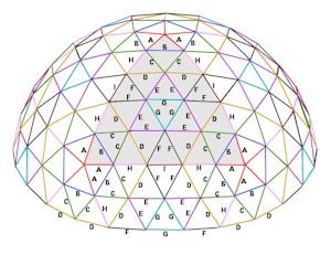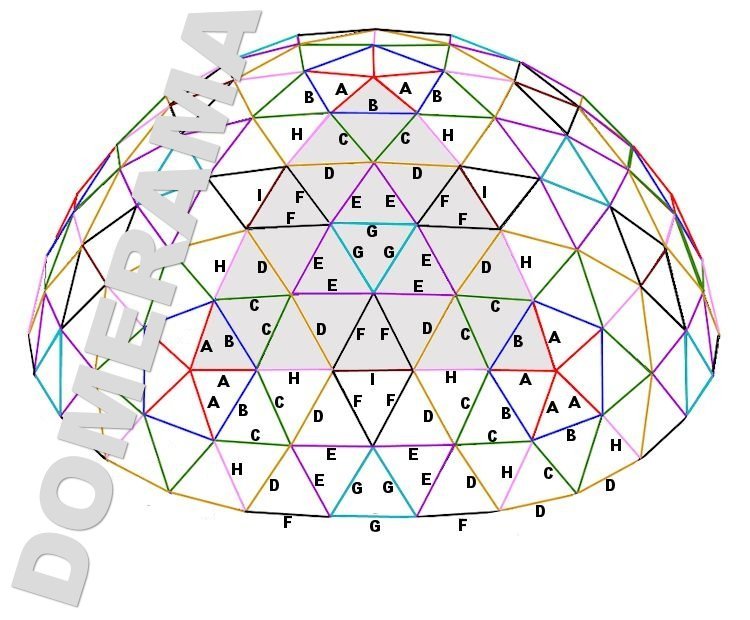 5V 3/8 Geodesic Dome Calculator Click here for the 5V 5/8 dome calculator This 5V 3/8 geodesic dome calculator is multi-purpose This is also a reverse geodesic dome calculator It will calculate any size of dome and display the lengths for each strut, total amount of material required, the weight of your geodesic dome and even the amount of material to cover your geodesic dome. Enter any value in any yellow box and it will calculate all other corresponding values. For example you can specify a 2-foot length for strut “B” and all other struts and related values will be calculated. Important note about odd geodesic dome frequencies (i.e. 3V, 5V) Most geodesic dome calculators on the Web don’t give a flat base such as this calculator. For a more detailed explanation, click here. NOTE: If you enter a measure in feet, your results are in feet or, in the case of floor area, square feet. Same goes for meters. When entering in feet, decimals are fractions of a foot or square foot (for example: 2.75 = 2’9″). Spherical radius Spherical diameter Height Floor Area Perimeter Perimeter: total length of all base struts feet (or meters) of pipe/lumber NOTE: if you are bolting conduit, regardless of dome size, add an extra 106 feet or 33 meters to total above (based on 3″ or 8cm for each strut) STRUTS ANGLE 30 X “A” 5.69° 30 X “B” 6.48° 60 X “C” 6.65° 60 X “D” 6.66° 50 X “E” 7.04° 50 X “F” 7.05° 30 X “G” 7.10° 30 X “H” 7.33° 10 X “I” 7.52° 350 STRUTS For conduit, you can round bend angles to the nearest degree. For timber domes, angles should be to the nearest tenth of a degree. Click here for assembly diagram Struts are vertex to vertex To connect together with bolts, you need to make them longer to drill holes in them. Connecting struts Many types of connectors are available for steel and timber geodesic dome. For more information, click here. If you use hubs 95 X 6-way connectors 6 X 5-way connectors 25 X 4-way connectors OR If you bolt struts together 126 bolts 126 nuts 252 washers For more information on cutting, bending and flattening struts, click here Floor Surface and Capacity Your calculated floor surface area is SQUARE FEET/SQUARE METERS NOTE: RESULTS IN THIS SECTION ARE BASED ON FEET. Geodesic Dome floor Capacity Concrete Cubic feet Cubic yards 4″ slab 6″ slab 8″ slab Plywood 1/2″ 4′ X 8′ sheets Estimated standing capacity Estimated dining capacity Estimated conference capacity For more info on capacity, click here How much will your geodesic dome weigh? Your calculated geodesic dome diameter is NOTE: RESULTS IN THIS SECTION ARE BASED ON FEET. 1/2″ 3/4″ 1″ 1 1/4″ 1 1/2″ 2″ EMT Wall thickness 0.042″ 0.049″ 0.057″ 0.065″ 0.065″ 0.065″ Lbs. kgs. STEEL SCHEDULE 40 Wall thickness 0.109″ 0.113″ 0.133″ 0.140″ 0.140″ 0.154″ Lbs. kgs. ALUMINUM SCHEDULE 40 Wall thickness 0.109″ 0.113″ 0.133″ 0.140″ 0.140″ 0.154″ Lbs. kgs. LUMBER 2″ X 4″ 2″ X 6″ 2″ X 8″ Lbs. Kgs. How much will your geodesic dome cost? The tables show sample costs. Material prices vary with suppliers and area. Your calculated geodesic dome requires feet (or meters) of pipe / lumber NOTE: RESULTS IN THIS SECTION ARE BASED ON FEET. Galvanized pipe – Steel Schedule 40 Your estimated pipe dollar cost is: 1/2″ @ $13 /10′ length 3/4 @ $17/10′ length 1″ @ $25 /10′ length 1 1/4″ @ $34 /10′ length 1 1/2″ @ $42 /10′ length 2″ @ $55 /10′ length Structure pipe – Aluminum Schedule 40 Your estimated pipe dollar cost is: 1/2″ @ $ /10′ length 3/4 @ $ /10′ length 1″ @ $ /10′ length 1 1/4″ @ $ /10′ length 1 1/2″ @ $ /10′ length 2″ @ $ /10′ length Structure pipe – EMT Your estimated pipe dollar cost is: 1/2″ @ $5.50 /10′ length 3/4 @ $ 8.80 /10′ length 1″ @ $18 /10′ length 1 1/4″ @ $19 /10′ length 1 1/2″ @ $22 /10′ length 2″ @ $3 2/10′ length Cover: approx. s.f. $ COST Canvas 20 oz. ($1/s.f.) Canvas 42 oz ($1.50/s.f.) Poly 3 mil ($0.05/s.f.) Poly 6 mil ($0.06/s.f.) Marine Shrink Wrap 7 mil. ($0.08/s.f.) Industrial fire-retardant Shrink Wrap 12 mil ($0.23/s.f.) Aluminet 70% shade cloth ($0.35/s.f.) Tyvek (housewrap) ($0.41/s.f.) Plywood 1/2″ ($25/ 4′ X 8′) Wood struts Your estimated wood dollar cost is: 2″X4″ @ $0.35 foot (avg.) 2″X6″ @ $0.50 foot (avg.) 2″X8″ @ $0.70 foot (avg.) Flooring: Plywood 1/2″ ($25/ 4′ X 8′) OSB 1/2″ ($9/ 4′ X 8′) Anchoring your geodesic dome Smaller geodesic domes do not require massive anchoring; many will use long ground screws or rebar bent in the shape of a “U”. But for a more solid, safe and permanent solution, concrete is poured into round forms to create piers.Many also use them as a base and frame for a riser wall. These piers can be of varying lengths, but as a rule for large permanent structures they should go past the frost line and preferably down to the bedrock. As for the number of piers, this depends on your engineer, though large geodesic domes will probably require a pier at each ground vertex or hub. The following calculates the required concrete for a single pier. Keep in mind rebar should be included to strengthen any pier. 10″ Circular Pier Length Cu. feet Cu. yard 60lb. bags 80lb. bags 4′ 2.18 0.08 4.4 3.3 6′ 3.27 .12 6.5 4.9 8′ 4.36 .16 8.7 6.5 12″ Circular Pier Length Cu. feet Cu. yard 60lb. bags 80lb. bags 4′ 3.14 0.12 6.3 4.7 6′ 4.71 0.17 9.4 7.0 8′ 6.28 0.23 12.6 9.4 16″ Circular Pier Length Cu. feet Cu. yard 60lb. bags 80lb. bags 4′ 5.59 0.21 11.2 8.4 6′ 8.38 0.31 16.8 12.6 8′ 11.17 0.41 22.3 16.8 20″ Circular Pier Length Cu. feet Cu. yard 60lb. bags 80lb. bags 4′ 4.36 0.16 8.8 6.6 6′ 6.54 0.24 13 9.8 8′ 8.72 0.32 17.4 13 Assembly Diagram Be Sociable, Share!