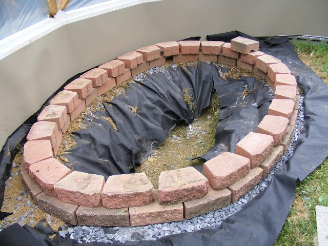 I scavenged the red stones and have been looking for a way to use them. My yard will look nicer without the stones piled in the corner. I plan to do 3 courses of blocks, then lay the liner, then a final course of block on top of the liner.