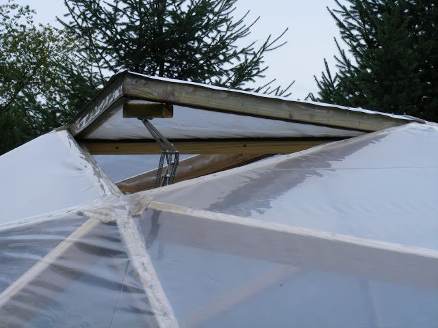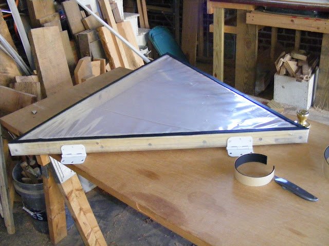 Here is the vent with weatherstripping on the bottom with hinges installed. I wrapped both sides of the frame with 6 mil greenhouse film (4-year) and stapled then taped the edges. The entire assembly is less than 10 pounds and should work well with an automatic vent opener.