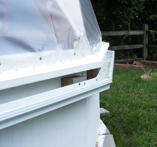 Just a few odds and ends to complete. The 2 top vents are in (I am waiting on an automatic opener) but I still need to build the bottom vents, install a fan, and cover over the door. You can see above how each seam has been stapled, nailed, and taped.
