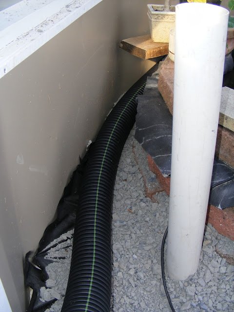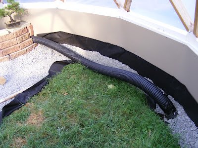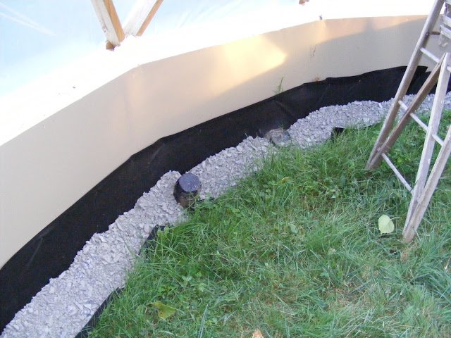 I bought another 30′ of drainage tube. It comes up out of the ground on the north side and will run along the perimeter behind the pond. Still looking for a fan to push the air through. I though of stopping by the RV store. I think they might have some DC fans for refrigerators. We’ll see.