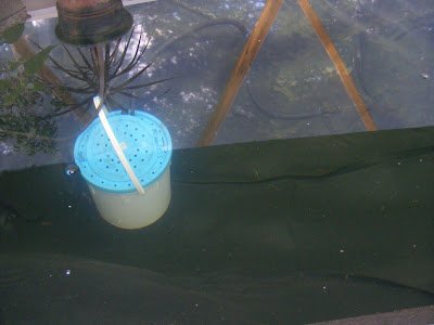 Then I added a few bio bags from the fish store. One of them I pulled directly out of my fish tank in my house. The thought is that some of the beneficial bacteria that keeps the tank clean will help the pond.