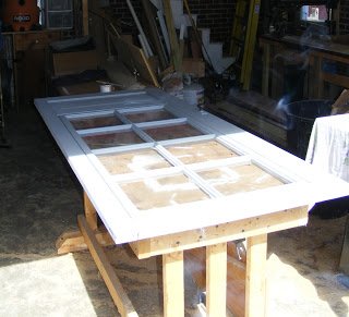 Last night it got pretty cold. I need to seal this thing up! If you remember, I picked this old door out of the trash and replaced a window pane. Yesterday I sanded it down a bit, cut it to size and now I am applying a new paint. Ace brand porch and steps paint. I think it will hold up nicely.