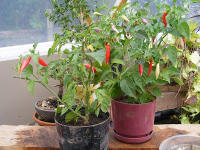 Here I have potted a few of my fire-hot aji omni-color chiles. I gave them a pretty heavy trimming and will keep them in the greenhouse until temps drop below 50.