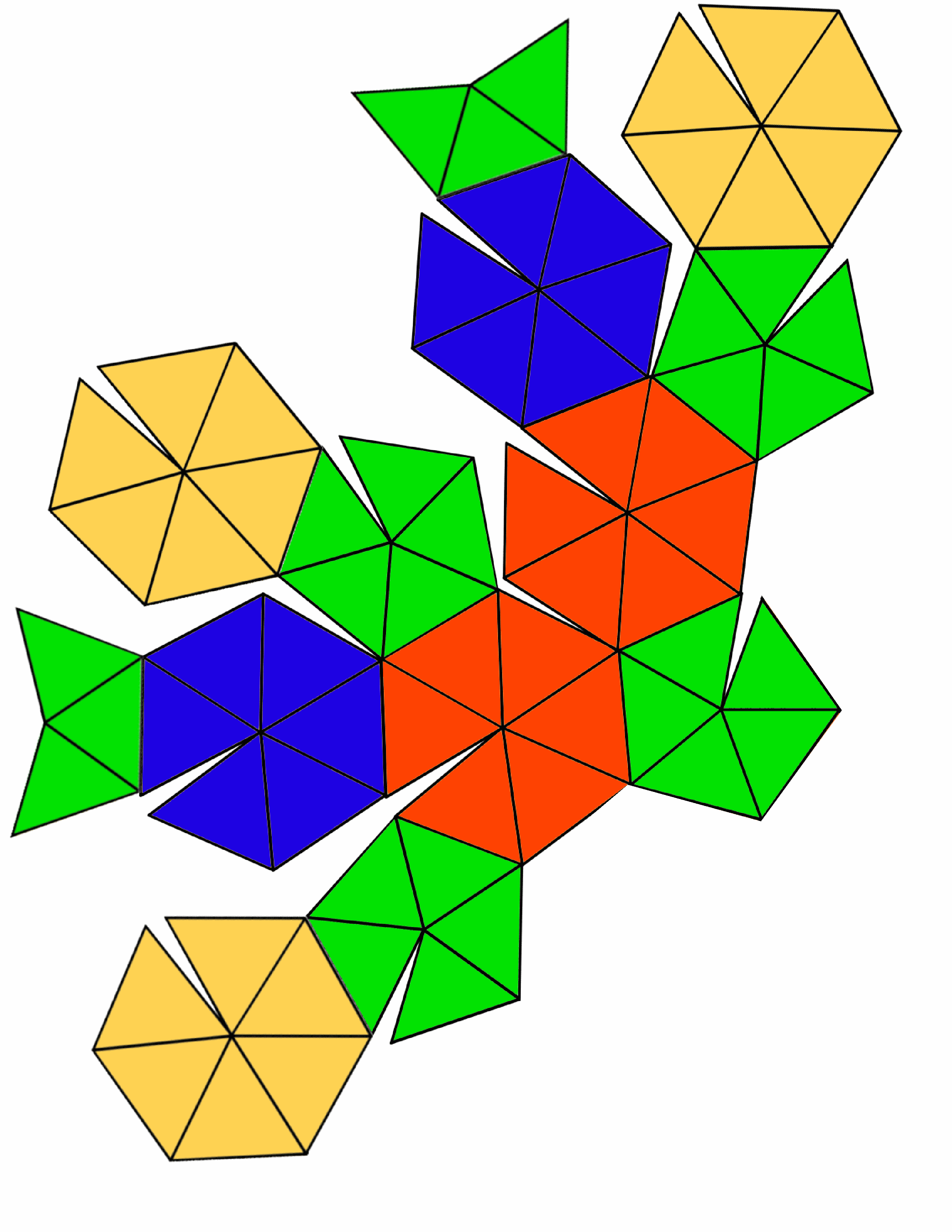 If you want an even larger paper dome, you can cut the drawing into smaller pieces, so when your printer resizes them to fit the page, you will have larger triangles. Use tape to reconnect the smaller pieces into one large piece. In the drawings below, I have duplicated the central pentagon to make it easy to see how they fit together. You will want to cut one pentagon away before taping the pieces together.