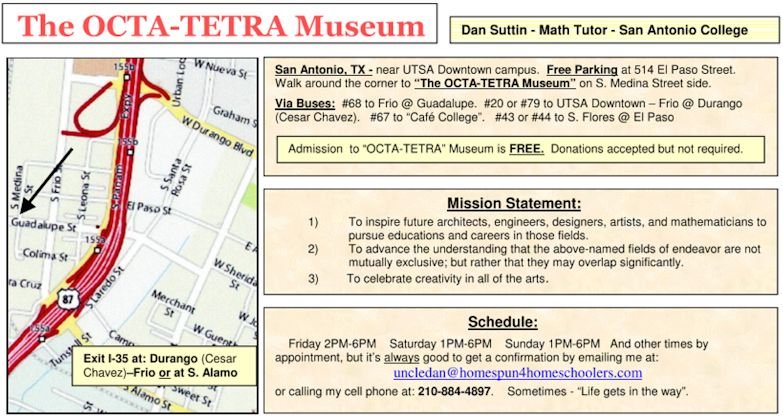 Uncle Dan Suttin has put together a large collection of stunning mathematical shapes into his own museum called the OCTA-TETRA MUSEUM in San Antonio, Texas Below are some images inside the museum. Also find all coordinates, directions and opening hours at the bottom of this page.