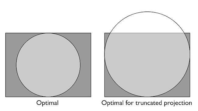 - Full fisheye vs partial fisheye, same issues as with fisheye projection: truncated or inscribed fisheye. Partial fisheye circles may be acceptable for domes with directional seating.