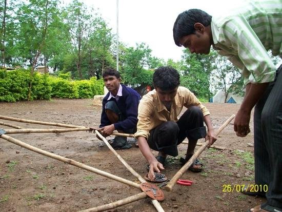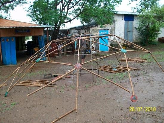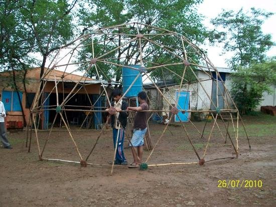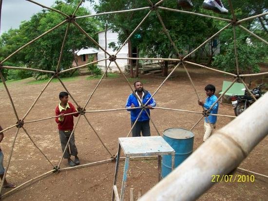 This page is a step-by-step construction of a 3V icosahedron bamboo geodesic dome set up at Vigyan Ashram, a village near Pune, Maharashtra, India.