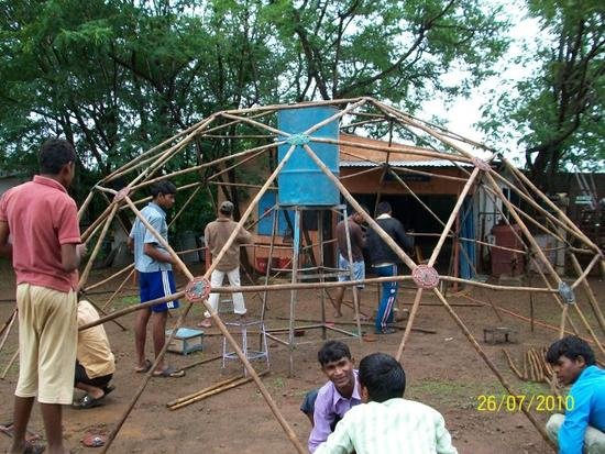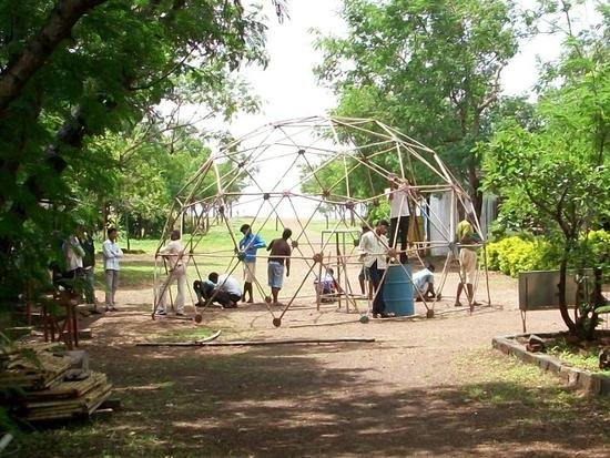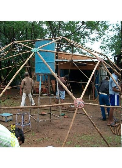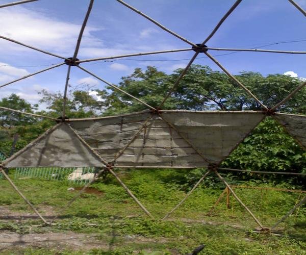 Converting the Bamboo Dome into a useful structure:Some attempts are being made to convert the bamboo dome into a useful structure at a low cost. Some of the triangles have been covered with ferro-crete or its equivalent.