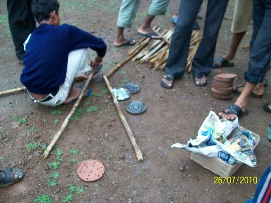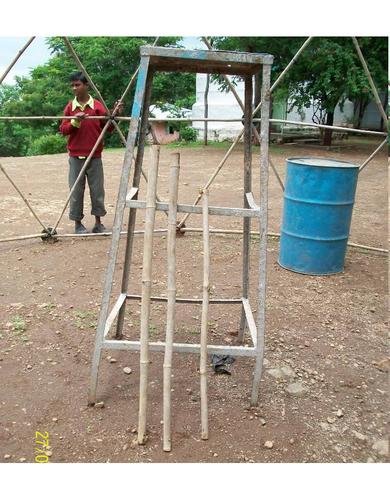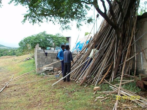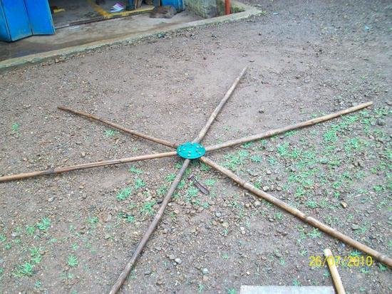 Three Chords:Vigyan Ashram, where this bamboo dome is being built,has been a pioneer in construction of domes in India. The domes are mostly 3 frequency icosahedrons, as is this dome. The photograph displays the three chords leaning against a stand. The longest chord, the left most of three, is called ‘a’ chord. The middle chord which is just slightly shorter than ‘a’ chord, is called the ‘b’ chord. The shortest chord,on extreme right, is called the ‘c’ chord. The variations in chord lengths gives the dome its spherical shape.