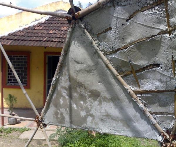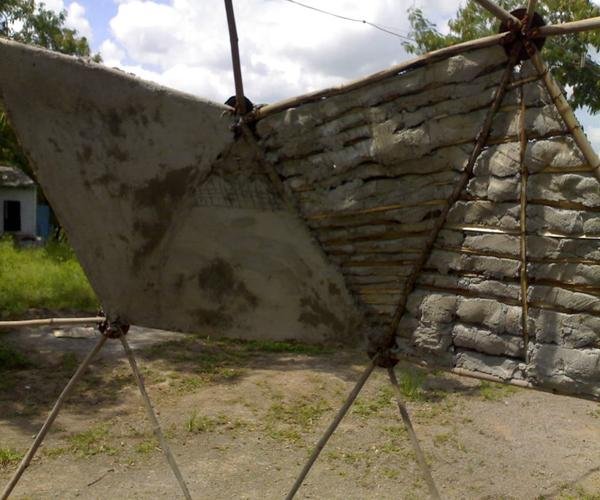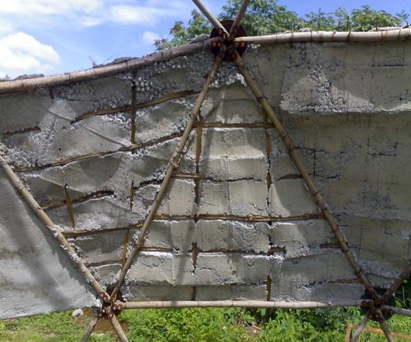 Panels Covered with thin bamboo strips:An experiment was made to cover one triangular panel with thin bamboo strips. The concrete did not cover the bamboo strips uniformly and the gaps can be seen in the photograph.