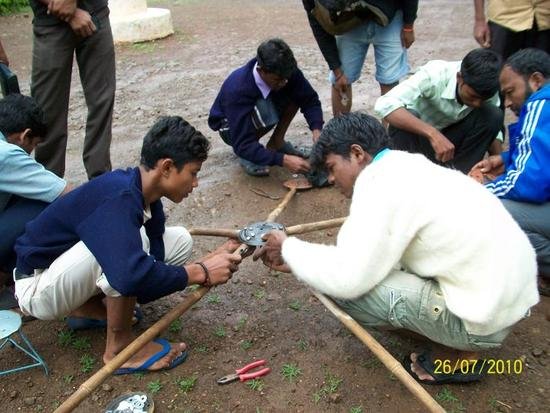 Cutting Bamboos:Students enjoying themselves cutting the chords. At low frequencies, domes can be built without precision cutting tools. At higher frequencies, there are more vertices’s and each vertex tends to become flatter. That is dangerous to the structure and precision is then required.