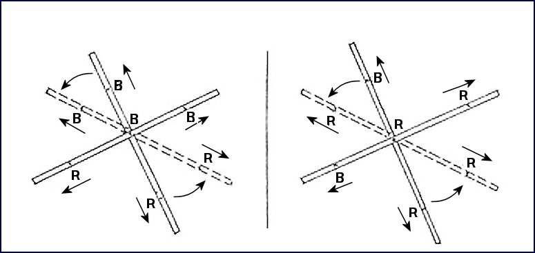 In all cases, when looking at a cross with the acute angles at the sides and the obtuse angles at the top and bottom, the member going from the upper right hand corner to the lower left hand corner always passes over the other member.