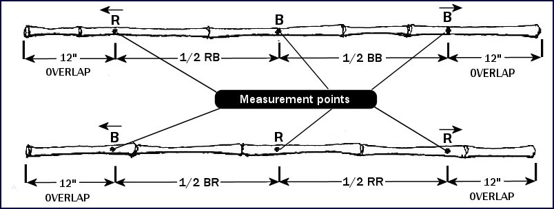 A line of color can be drawn around the bamboo members at each measuring point. Use blue for the “B” points and use red for the “R” points.