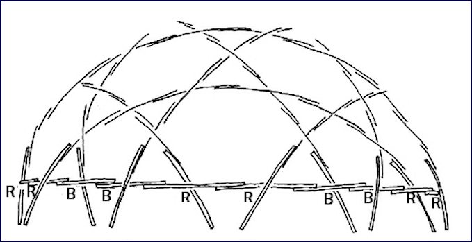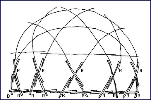 For these factors, the radius of the dome is 1.00. To construct a 22′ dome (11′ radius) the lengths of the arcs would be as follows: BB=2.86′, BR=3.41′, RR=3.59′.