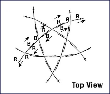 | Step A: Tie together two “B” crosses as shown in in the diagram. Note that the end measuring points have the same designation as the cross to which they are connected. | Step B: Add two more “B” crosses in the same manner as shown in step A. | Step C: Add fifth “B” cross between the untied legs. In order to insert this cross, all crosses will be twisted so that a regular pentagon is formed. |