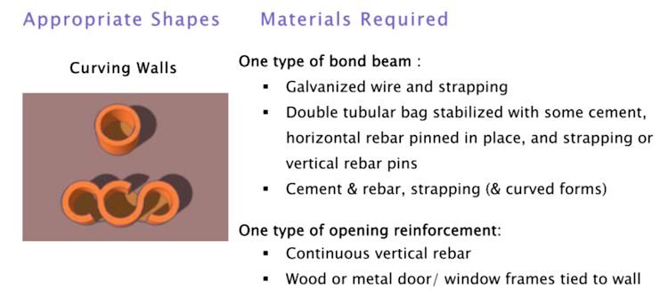 The strength of an earthbag wall is, like adobe, related to its shape. Compact and symmetrical layouts reduce damaging quake forces.i Curving walls are the strongest shapes if little or no reinforcement is available. Straight walls can be strengthened with corner or internal bracing, a strong bond beam, and/or earthbag buttresses.