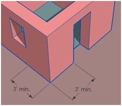 Walls must have at least 36-39” (1 m) from each opening to a corner. If shelters have a single opening in each wall, the walls must be at least 8’ (2.4 m) long to house a 24” (60 cm) wide window. They must be 8’6” (2.6 m) long for a 30” (75 cm) wide doorway.