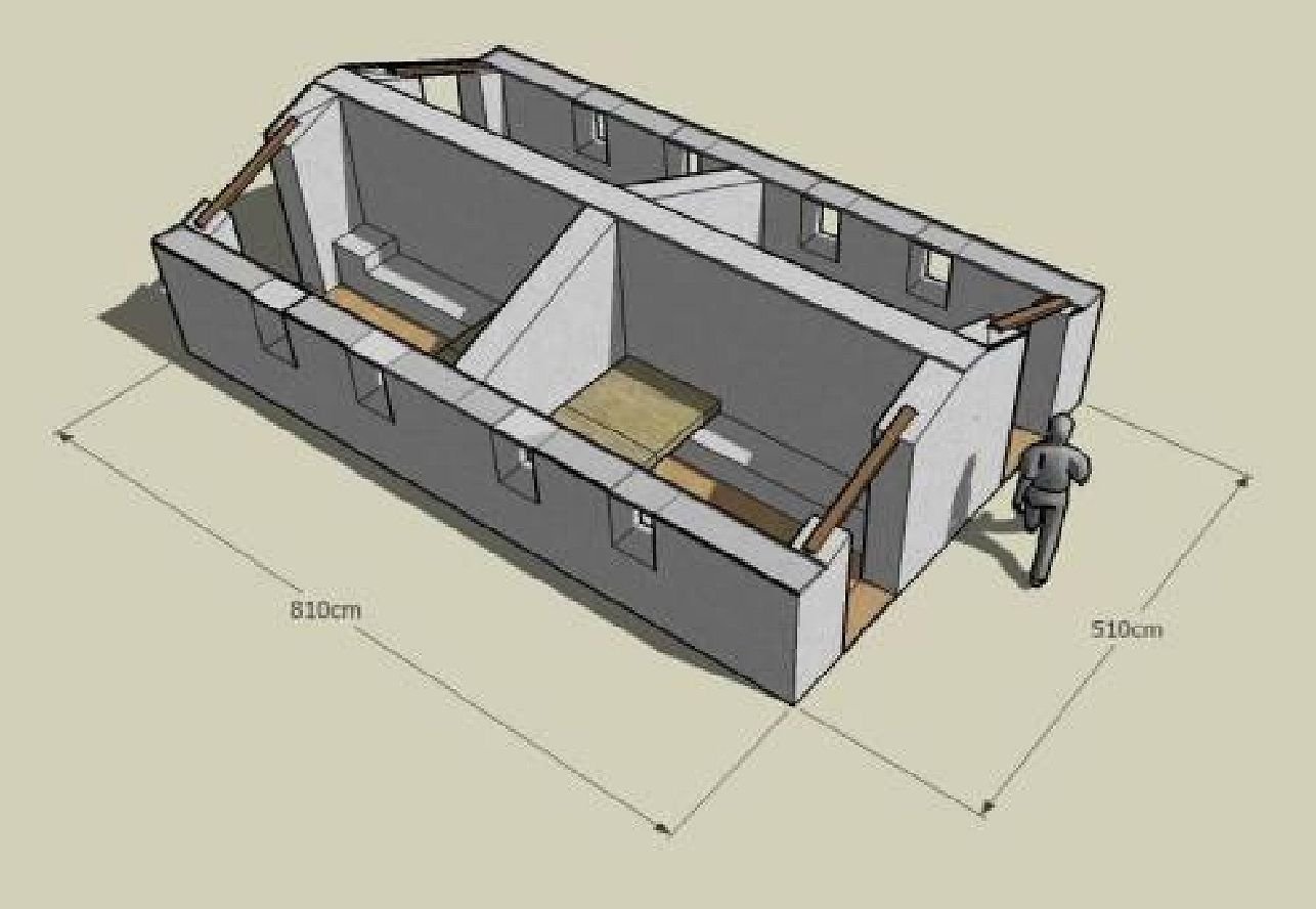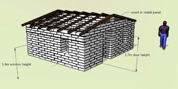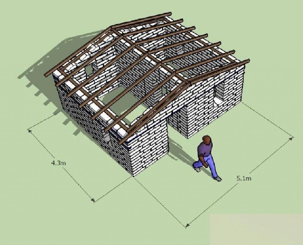 This will provide weight to hold the roof down in strong winds as well as stiffening to unite the structure and resist earthquake shocks. This house type can be doubled to make a quad shelter.