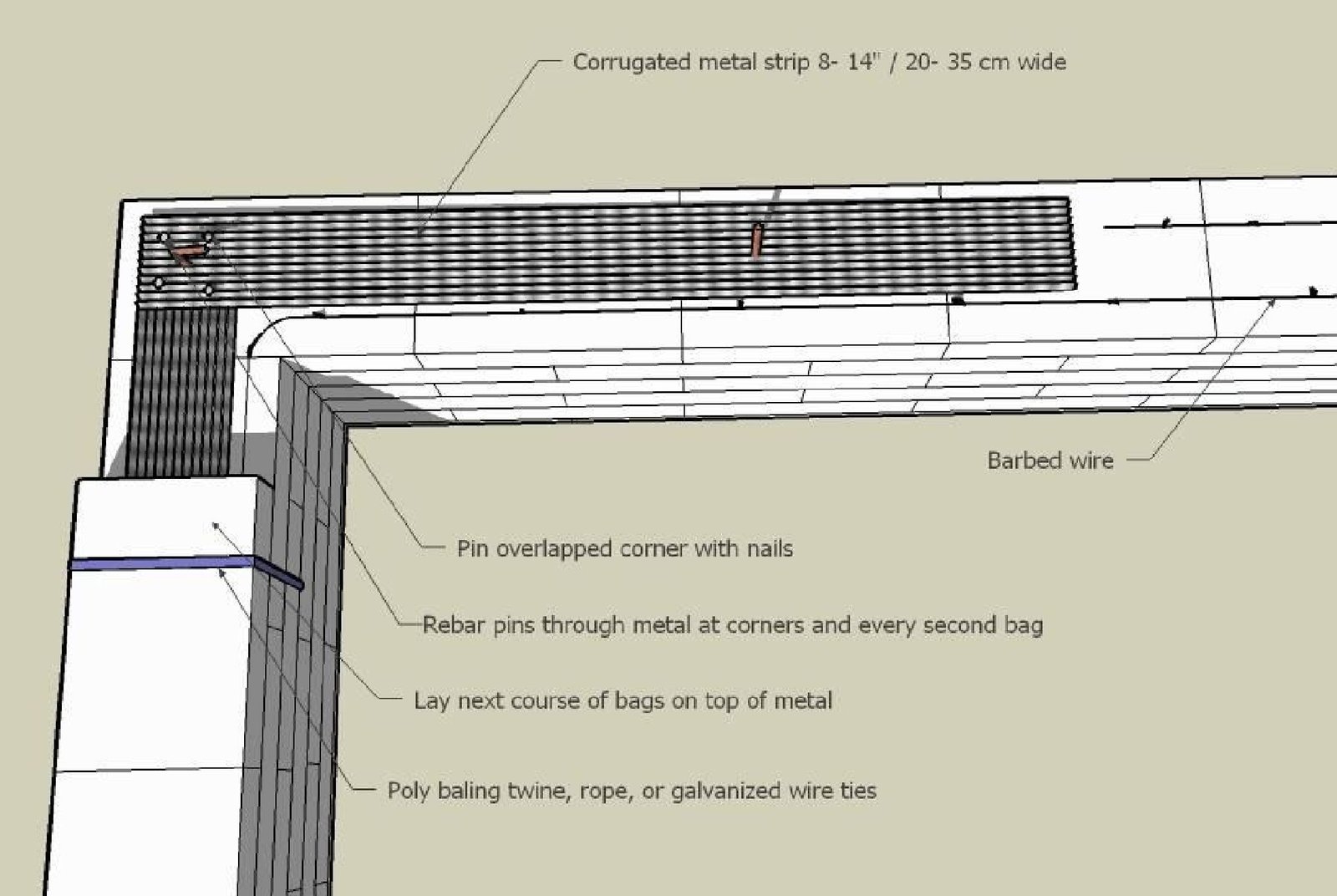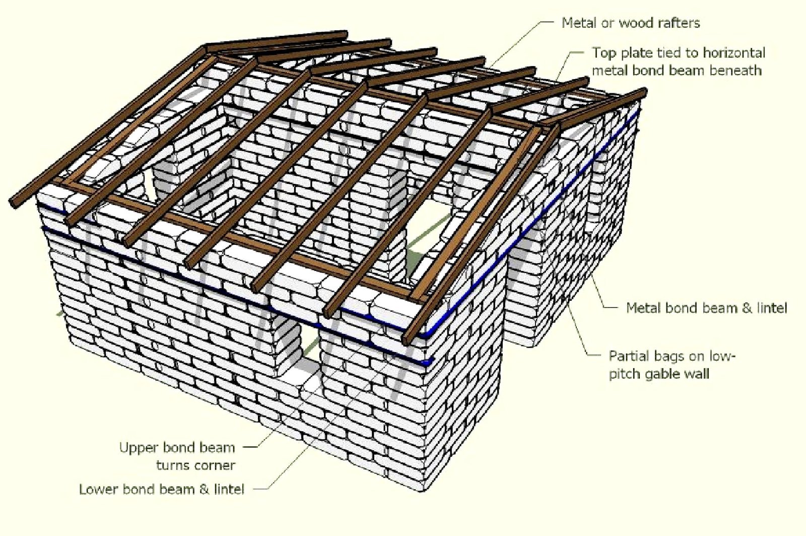 This design includes a reinforced composite bond beam of corrugated metal strip tied to 3 rows of bags and a wood top plate. (The bond beam is actually centered in the wall, but shown below conceptually).