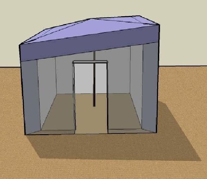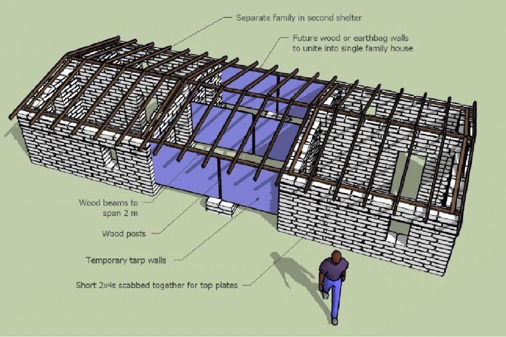 An alternate use, shown below, when there is great need for shelter is to build 2 separate units and suspend tarp shelter walls between them. The materials for this would cost under $1000 US with tarp roofs.