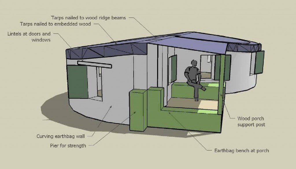 Earthbag shelters in non-seismic areas can have lower walls because they do not need as strong a bond beam. They will need some wood or metal as lintels across openings to stiffen the structure.