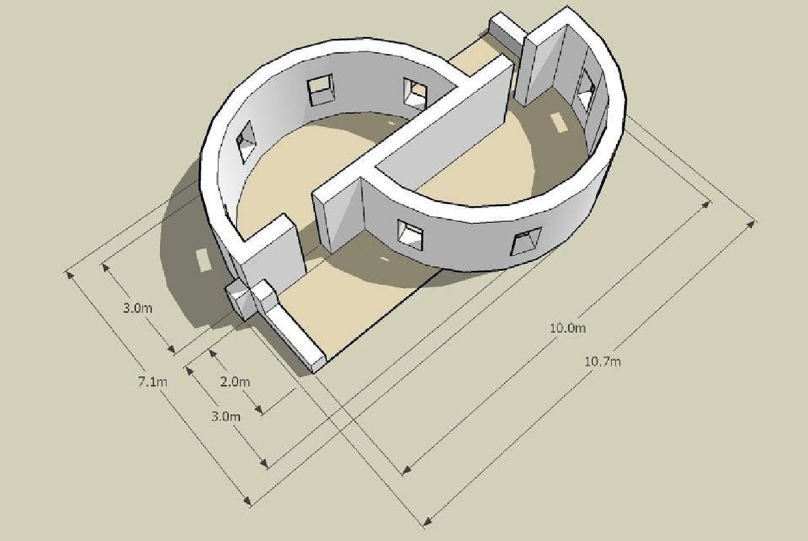If no very little wood or metal is available, the natural strength of curving walls can be used, if these shapes are acceptable to recipients. Curving walls are quicker and more economical to build in earthbag than rectangular buildings with corners.