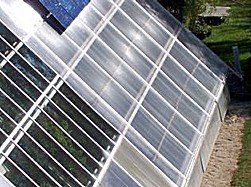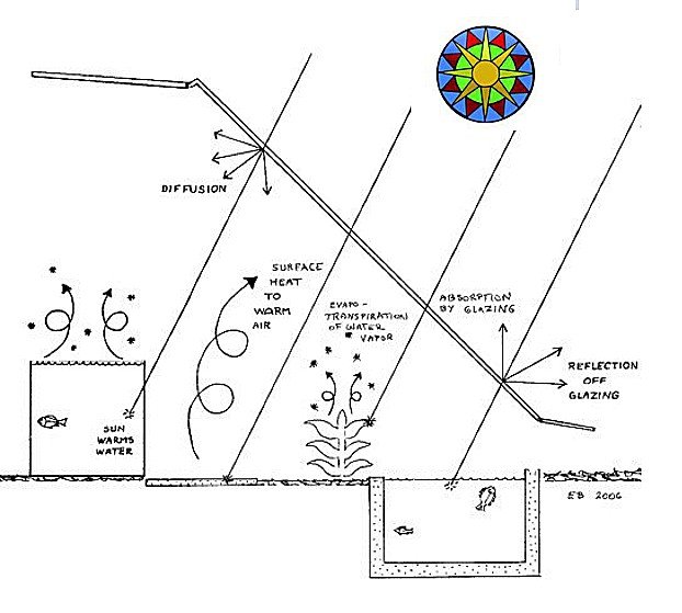 Sunlight that gets through the glazing strikes plants, soil, water, wood, stone masonry, and other surfaces. Most of the sunlight energy entering a bioshelter ends up as heat stored in thermal mass – plants, soil, materials, air or as water vapor in the air.