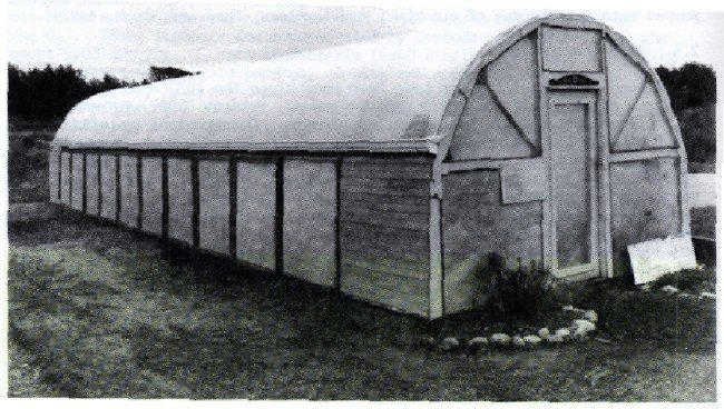 Two people stretched a 20 by 96-foot (6.1 x 29-m) sheet of the film over the quonset frame, fastened it to the endwalls and clamped the glazings together in an airtight seal with a heavy plastic ziplock track.