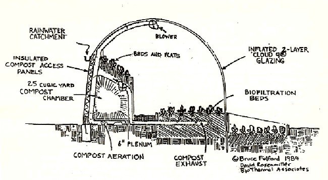 Heat Transfer System: Heat is transferred from the compost chamber to the lower filter/bed by drawing off water vapor from the top of the compost chamber and blowing it through perforated pipe in the front growing bed. Here and in the growing bed suspended directly above the compo sting chamber heat is efficiently transferred as the water vapor condenses and releases the stored latent heat of evaporation to the surfaces on which it lands.