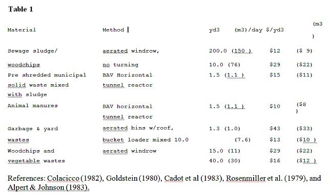 Transportation of the compost materials must be reliable and there must be good access even in poor weather conditions. It is imperative to consider the duration of residence of the compost on site, storage requirements, transportation and any materials-handling functions, such as screening or bagging the finished product. These considerations all have significant bearing on the success or failure of a given composting and/or greenhouse operation. Table 1 gives some recorded composting costs for various methods of differing scale, although actual costs vary widely within each category.