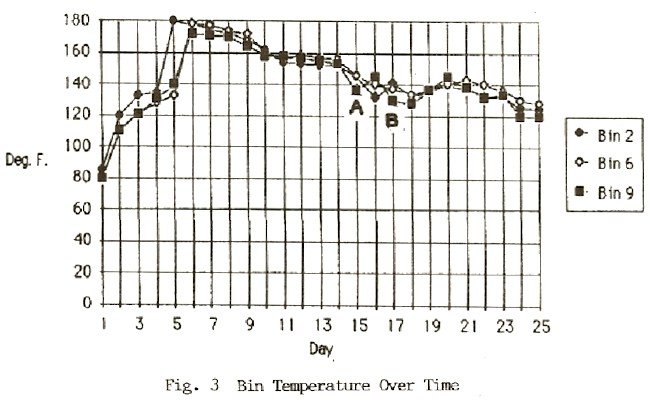 Figure 3 shows the temperature of three bins simultaneously loaded into the east end, center and west end of the composting chamber. The near uniformity of the temperature curves demonstrates the homogeneous nature of the feedstock and equal conditions of aeration offered by the compost chamber. The drop in temperatures on days 15 and 16 (A) exhibits the dramatic heat absorption capacity of cold water added to the compost on those days. The subsequent temperature drop (B) reflects excessive heat removal caused when the compost aeration blower was left on for 2 hours. The soil has some thermal storage capacity, which is very useful in supplying extra heat on cold nights.