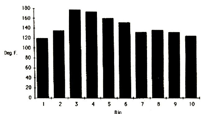 Figure 4 shows relative temperatures of the ten bins, and the date each was loaded. Bins are never all filled at once. A constant rotation of compost in its hottest phase is cycled through the composting greenhouse. Two bins are loaded every four or five days. Bins 1 and 2 have just been loaded. Bin 3 is hotter than optimum for actual decomposition and C02 evolution, and indicates that more aeration of compost at this stage could be desirable. After 24 days, Bin 10 has dropped below 120 degrees F (490 C)and will be replaced with a charge of fresh manure. The cool compost is transferred to hotbeds for curing. Special conditions in the growing bed directly above the hottest compost appear to be ideal for germinating seedlings and transplanting seedlings such as 21-day-old lettuce plugs. The 12-inch thick upper growing bed has apparently been a successful passive biofilter of ammonia.