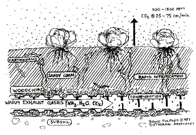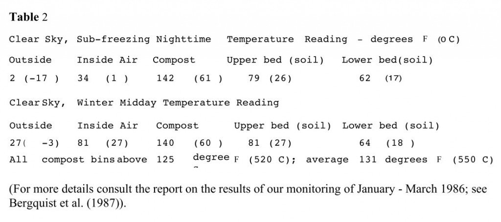 When warm moist air from the compost chamber is being blown into the lower growing bed on a daily basis, the soil temperatures there can be maintained above 60 degrees F (160 C) even in extremely cold weather. Temperatures in the lower bed peaked at 69 degrees F (210 C) during our monitoring in February 1986. The temperature in the lower bed can drop to 50 degrees F (100 C) after several clear and cold nights if hot exhaust gases are not intermittently blown through the soil. After such a cooling trend, it took several days of channelling air from the compost chamber through the biofilter to raise the temperature from 50 and 60 degrees F (10 – 160 C). We found that the blowers could easily remove too much heat and water from the compost if left on continuously. Too much aeration will prematurely dry out the compost and subsequently reduce bacterial activity and heat production.