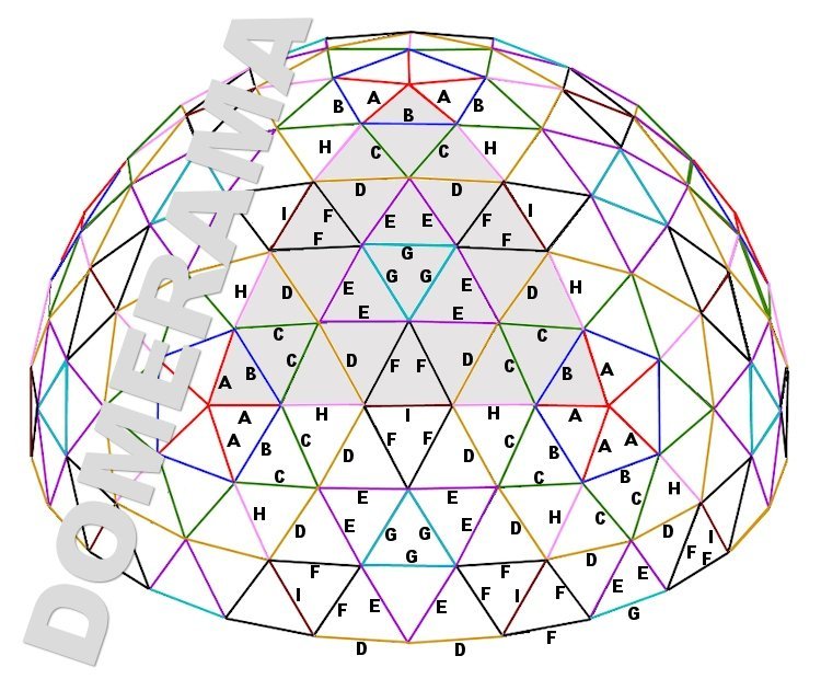 5V Geodesic Dome Calculators Build your own geodesic dome Click here for the 5V 7/15 (3/8) dome calculator This 5V 8/15 (a.k.a. 5/8) geodesic dome calculator is multi-purpose This is also a reverse geodesic dome calculator It will calculate any size of dome and display the lengths for each strut, total amount of material required, the weight of your geodesic dome and even the amount of material to cover your geodesic dome. Enter any value in any yellow box and it will calculate all other corresponding values. For example you can specify a 2-foot length for strut “B” and all other struts and related values will be calculated. Important note about odd geodesic frequencies (i.e. 3V, 5V) Most geodesic dome calculators on the Web don’t give a flat base For a more detailed explanation, click here. NOTE: If you enter a measure in feet, your results are in feet or, in the case of floor area, square feet. Same goes for meters. When entering in feet, decimals are fractions of a foot or square foot (for example: 2.75 = 2’9″). Spherical radius Spherical diameter Height Floor Area Perimeter Perimeter: total length of all base struts feet (or meters) of pipe/lumber NOTE: if bolting struts, you need to add extra length to your total above. The formula is: (tip to hole center) X 2 X number of struts. Ex.: a dome requiring 100 struts with bolts 3/4″ from the tip requires 100 X 3/4″ X 2 = 150 inches (12.5 feet) more to the total above. STRUTS ANGLE 30 X “A” 5.69° 30 X “B” 6.48° 60 X “C” 6.65° 70 X “D” 6.66° 70 X “E” 7.04° 80 X “F” 7.05° 35 X “G” 7.10° 30 X “H” 7.33° 20 X “I” 7.52° 425 STRUTS For conduit, you can round bend angles to the nearest degree. For timber domes, angles should be to the nearest tenth of a degree. Click here for assembly diagram Struts are vertex to vertex To connect together with bolts, you need to make them longer to drill holes in them. Connecting struts Many types of connectors are available for steel and timber geodesic dome. For more information, click here. If you use `hubs 120 X 6-way connectors 6 X 5-way connectors 25 X 4-way connectors OR If you bolt struts together 151 bolts 151 nuts 302 washers For more information on cutting, bending and flattening struts, click here Floor Surface and Capacity Your calculated floor surface area is SQUARE FEET/SQUARE METERS NOTE: RESULTS IN THIS SECTION ARE BASED ON FEET. Geodesic Dome floor Capacity Concrete Cubic feet Cubic yards 4″ slab 6″ slab 8″ slab Plywood 1/2″ 4′ X 8′ sheets Estimated standing capacity Estimated dining capacity Estimated conference capacity For more info on capacity, click here How much will your geodesic dome weigh? Your calculated geodesic dome diameter is NOTE: RESULTS IN THIS SECTION ARE BASED ON FEET. 1/2″ 3/4″ 1″ 1 1/4″ 1 1/2″ 2″ EMT Wall thickness 0.042″ 0.049″ 0.057″ 0.065″ 0.065″ 0.065″ Lbs. kgs. STEEL SCHEDULE 40 Wall thickness 0.109″ 0.113″ 0.133″ 0.140″ 0.140″ 0.154″ Lbs. kgs. ALUMINUM SCHEDULE 40 Wall thickness 0.109″ 0.113″ 0.133″ 0.140″ 0.140″ 0.154″ Lbs. kgs. LUMBER 2″ X 4″ 2″ X 6″ 2″ X 8″ Lbs. Kgs. How much will your geodesic dome cost? The tables show sample costs. Material prices vary with suppliers and area. Your calculated geodesic dome requires feet (or meters) of pipe / lumber NOTE: RESULTS IN THIS SECTION ARE BASED ON FEET. Galvanized pipe – Steel Schedule 40 Your estimated pipe dollar cost is: 1/2″ @ $13 /10′ length 3/4 @ $17/10′ length 1″ @ $25 /10′ length 1 1/4″ @ $34 /10′ length 1 1/2″ @ $42 /10′ length 2″ @ $55 /10′ length Structure pipe – Aluminum Schedule 40 Your estimated pipe dollar cost is: 1/2″ @ $ /10′ length 3/4 @ $ /10′ length 1″ @ $ /10′ length 1 1/4″ @ $ /10′ length 1 1/2″ @ $ /10′ length 2″ @ $ /10′ length Structure pipe – EMT Your estimated pipe dollar cost is: 1/2″ @ $5.50 /10′ length 3/4 @ $ 8.80 /10′ length 1″ @ $18 /10′ length 1 1/4″ @ $19 /10′ length 1 1/2″ @ $22 /10′ length 2″ @ $3 2/10′ length Cover: approx. s.f. $ COST Canvas 20 oz. ($1/s.f.) Canvas 42 oz ($1.50/s.f.) Poly 3 mil ($0.05/s.f.) Poly 6 mil ($0.06/s.f.) Marine Shrink Wrap 7 mil. ($0.08/s.f.) Industrial fire-retardant Shrink Wrap 12 mil ($0.23/s.f.) Aluminet 70% shade cloth ($0.35/s.f.) Tyvek (housewrap) ($0.41/s.f.) Plywood 1/2″ ($25/ 4′ X 8′) Wood struts Your estimated wood dollar cost is: 2″X4″ @ $0.35 foot (avg.) 2″X6″ @ $0.50 foot (avg.) 2″X8″ @ $0.70 foot (avg.) Flooring: Plywood 1/2″ ($25/ 4′ X 8′) OSB 1/2″ ($9/ 4′ X 8′) Anchoring your geodesic dome Smaller geodesic domes do not require massive anchoring; many will use long ground screws or rebar bent in the shape of a “U”. But for a more solid, safe and permanent solution, concrete is poured into round forms to create piers.Many also use them as a base and frame for a riser wall. These piers can be of varying lengths, but as a rule for large permanent structures they should go past the frost line and preferably down to the bedrock. As for the number of piers, this depends on your engineer, though large geodesic domes will probably require a pier at each ground vertex or hub. The following calculates the required concrete for a single pier. Keep in mind rebar should be included to strengthen any pier. 10″ Circular Pier Length Cu. feet Cu. yard 60lb. bags 80lb. bags 4′ 2.18 0.08 4.4 3.3 6′ 3.27 .12 6.5 4.9 8′ 4.36 .16 8.7 6.5 12″ Circular Pier Length Cu. feet Cu. yard 60lb. bags 80lb. bags 4′ 3.14 0.12 6.3 4.7 6′ 4.71 0.17 9.4 7.0 8′ 6.28 0.23 12.6 9.4 16″ Circular Pier Length Cu. feet Cu. yard 60lb. bags 80lb. bags 4′ 5.59 0.21 11.2 8.4 6′ 8.38 0.31 16.8 12.6 8′ 11.17 0.41 22.3 16.8 20″ Circular Pier Length Cu. feet Cu. yard 60lb. bags 80lb. bags 4′ 4.36 0.16 8.8 6.6 6′ 6.54 0.24 13 9.8 8′ 8.72 0.32 17.4 13 Assembly Diagram Be Sociable, Share!