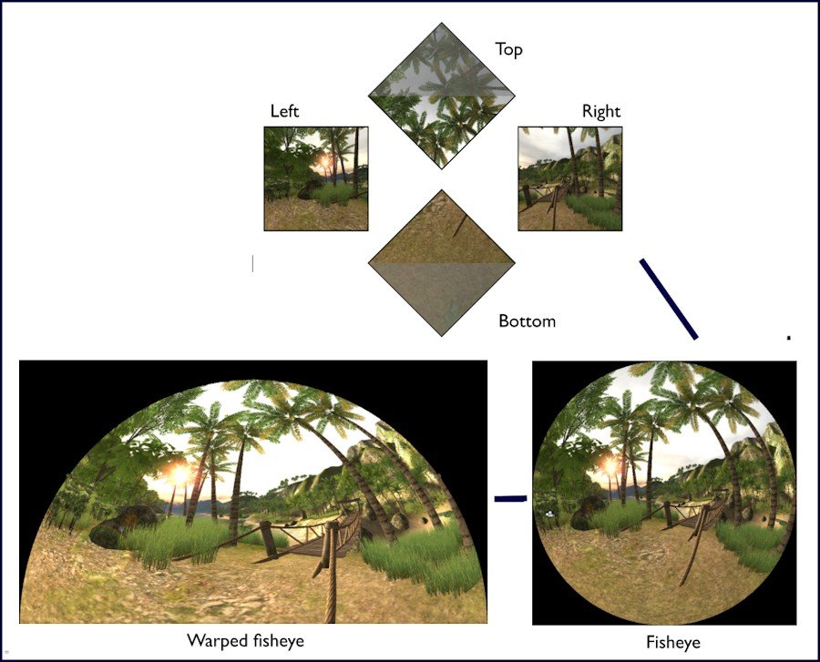 - The scene is rendered 4 times and the resulting images, instead of being displayed, are mapped onto a mesh that creates a fisheye projection when rendered with an orthographic camera.