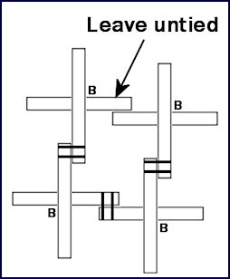 Place members at right angles to each other and tie firmly, but not too tight. During assembly of the dome, the crosses will twist into proper position as shown.