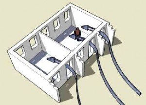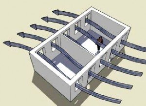 ➔ Keep sunlight off of building walls: After aiming the building to catch the breeze, try to face the long sides (with most of the windows) towards the south and north so the roof overhang shades walls and windows in the middle of the day.