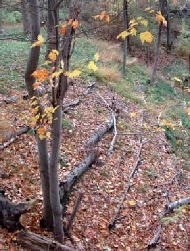 It is a good idea to place a silt fence of filter fabric along the downhill side of building work. If siltation fabric is not available, bundles of small branches called fascines or straw bales can