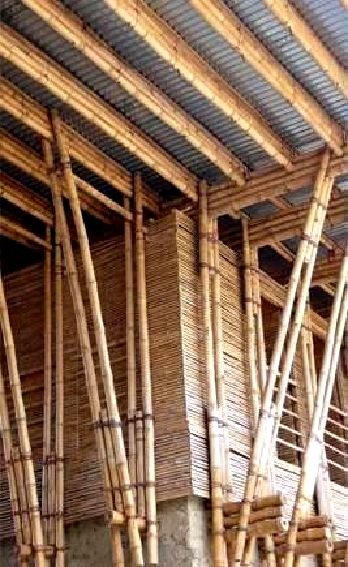 Bamboo is cheap since it grows quickly, being ready for building after 3- 6 years. Bamboo roof rafters can also span much further than wood. If bamboo is dried well and then given asimple smoke treatment it can last a very long time as long as it is not rained on. Bamboo works best inside, or under a wide roof overhang. It can be bolted, if the inside is packed with a little concrete and let dry before the bolt is tightened all the way.