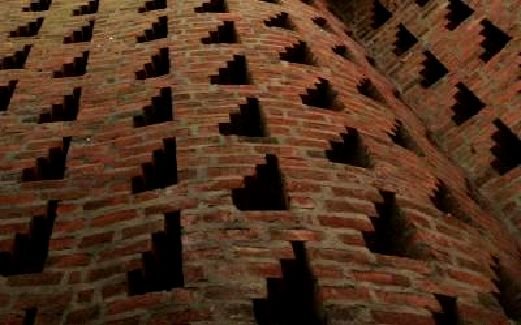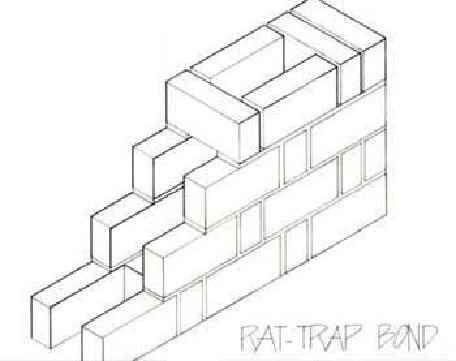 Common fired bricks can make versatile thin walls. Solid brick works best where walls are shaded by plants or other buildings, because they do not insulate well. Rat trap bond stands bricks on edge around a hollow center. It uses a little more brick than a solid single layer wall, but in parts of India allows a building temperature inside 58 C lower than outside.
